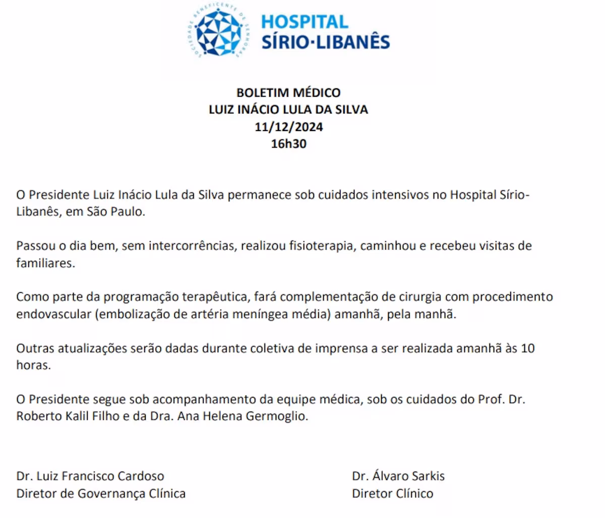 O hospital onde o presidente está internado afirmou que outras atualizações sobre o estado de saúde do chefe do Executivo serão dadas na quinta-feira às 10h. “Presidente Luiz Inácio Lula da Silva permanece sob cuidados intensivos no Hospital Sírio Libanês, em São Paulo”, diz o texto. “O presidente segue sob acompanhamento da equipe médica, sob os cuidados do Prof. Dr. Roberto Kalil Filho e da Dra. Ana Helena Germoglio.