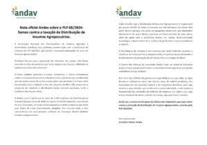 A Andav como a porta-voz de mais de 3.300 empresas da Distribuição de Insumos Agropecuários de todas as regiões do Brasil, repercute a apreensão de seus associados, em especial das pequenas e médias empresas que terão seus fluxos de caixa drasticamente atingidos. Em cenários onde a livre concorrência não será possível, milhares de empregos diretos também estarão comprometidos. Cabe ressaltar que a Distribuição de Insumos Agropecuários é responsável por quase metade de todos os insumos que são entregues ao campo. Boa parte destas entregas são junto aos pequenos produtores que dependem diretamente do apoio destas empresas no financiamento de suas safras, além do apoio com a assistência técnica em campo, democratizando tecnologias e disponibilizando a milhões de produtores manejos modernos e seguros.