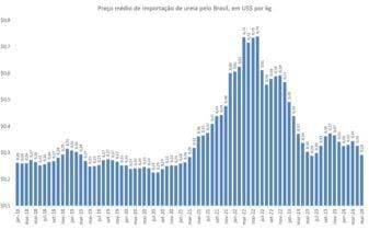 O preço da ureia importada pelo Brasil em maio de 2024 foi de US$ 0,29 por kg, o segundo ano consecutivo de queda no período e no menor patamar para um mês de maio desde 2020.
