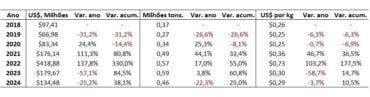 A Tabela abaixo apresenta os dados de importação de ureia pelo Brasil, nos meses de maio, entre 2018 e 2024, segundo dados da COMEX.
